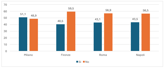 L’indagine IREF 2023-2024 fornisce informazioni sulla localizzazione delle attività svolte dai volontari nelle quattro città (Figura 1). Circa la metà dei volontari è coinvolta in associazioni situate nel proprio quartiere, con il valore più alto a Milano (51,1%) e il più basso a Firenze (40,5%). [verificare: la figura 1 mostra la quota di volontari che svolgono attività di volontariato nel quartiere in cui vivono?]